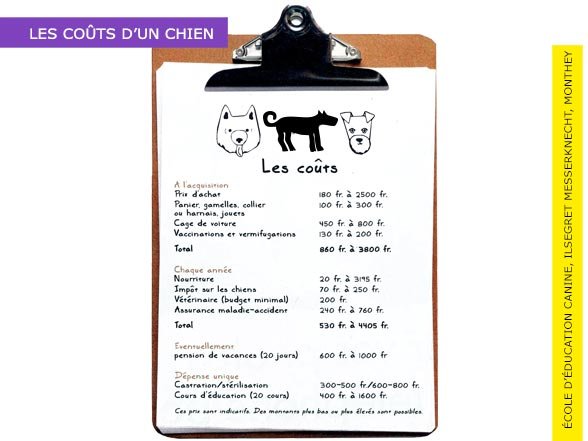 Chaque année, il faut encore régler un impôt sur les chiens. Il est, par exemple, de 70 CHF par an à Bellinzone (Tl), de 130 CHF à Delémont (JU), de 190 CHF à Lausanne (VD) ou encore de 250 CHF à Romanel-sur-Lausanne. En outre, si vous devez mettre votre animal en pension lors de vos vacances, il vous en coûtera, grosso modo, de 30 fr. à 50 fr. par jour et parfois plus, soit, pour 20 jours, entre 600 et 1000 CHF.